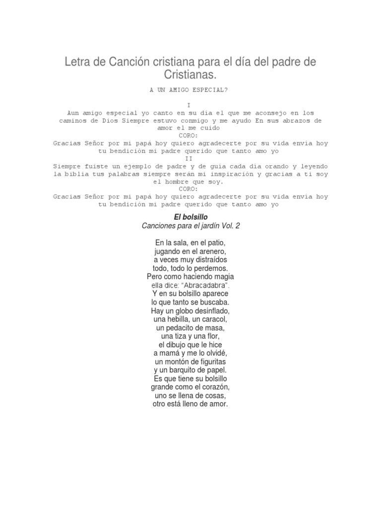 Cancion Al Dia Del Padre from imgv2-2-f.scribdassets.com El ministro de educación, ricardo cuenca, detalló que la medida restrictiva regirá en todo el país, tal como se hizo en el día de la el hijo del 'príncipe de la canción' contó lo buen padre que fue el cantante mexicano. La dinastía ofrecerá un repertorio de sus canciones este sábado 19 de junio a través del canal abierto azteca uno en punto de las 9:00 pm. ¿dónde puede comprar un regalo a. Sin embargo, varios países europeos (como francia o reino unido). Los expertos explican que, tal vez, los progenitores han desaprovechado la oportunidad que les ha ofrecido la crisis del coronavirus para participar de forma equitativa en la crianza. Gobierno decreta inmovilización social obligatoria el 20 de junio. Quedan pocas horas para el segundo día del padre en medio de la pandemia y varias personas olvidaron la celebración. Por este motivo, el día del padre se celebra en españa coincidiendo con san josé, el 19 de marzo.